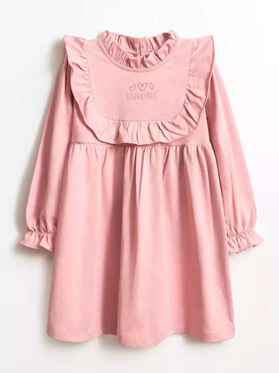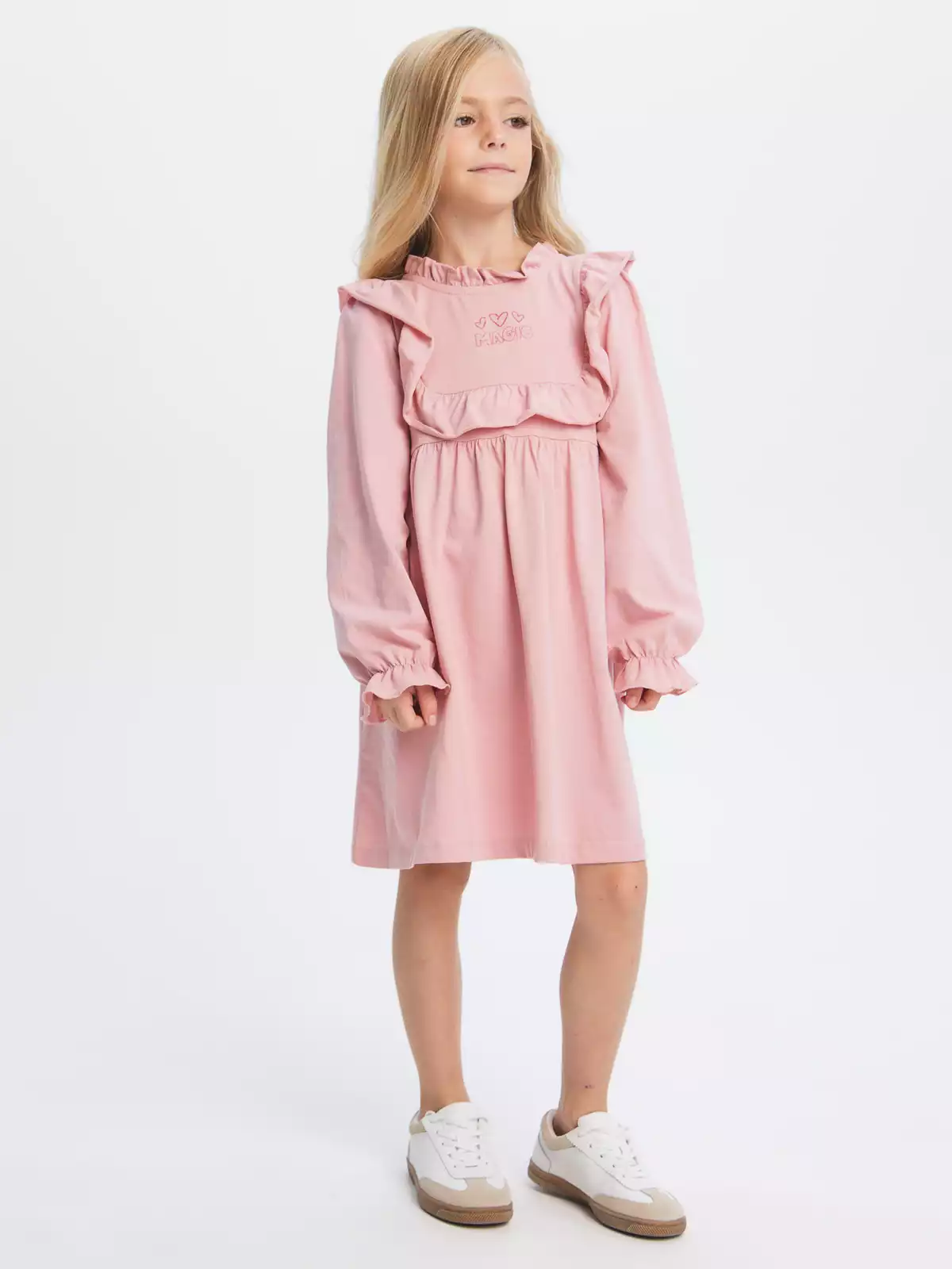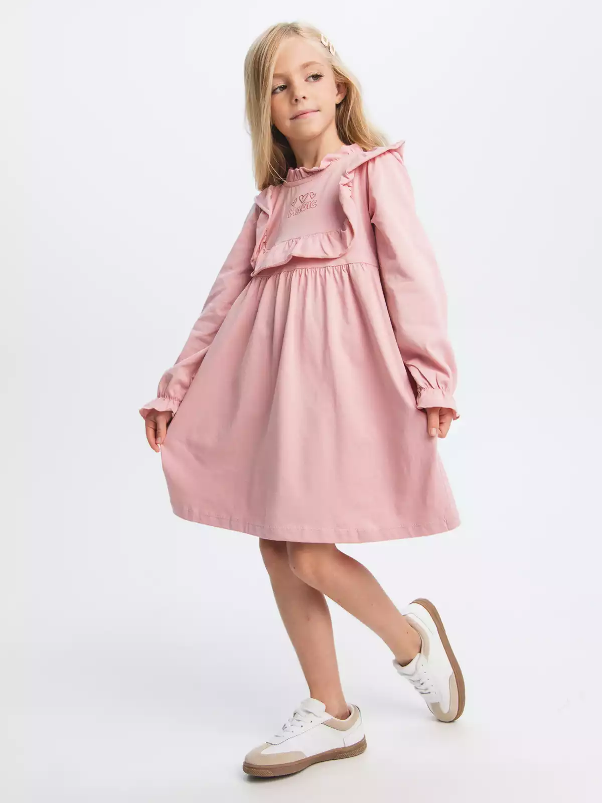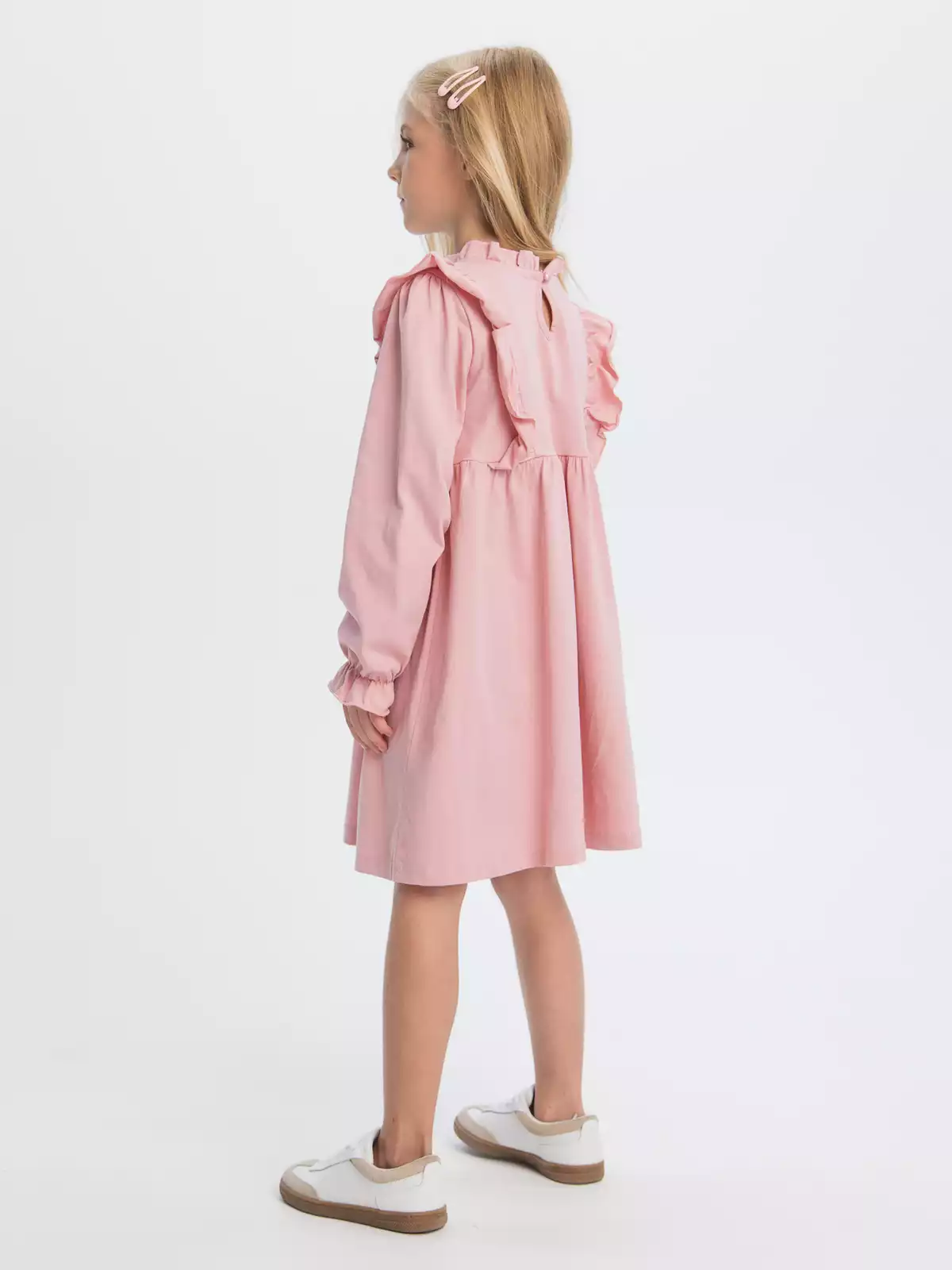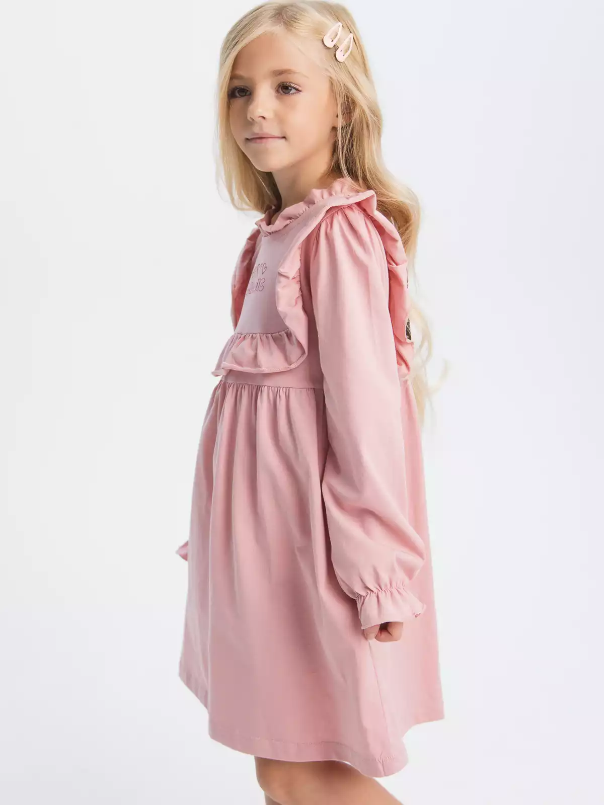 Очень красивое повседневное платье для девочки с длинными рукавами из натурального хлопка. Спереди и сзади декоративные рюши с контрастной отделкой. Снизу рукава оборка с резинкой с контрастной отделкой. Вещь будет актуальной в прохладное время года. Модель очень интересная и стильная. Свободный крой с расширенной юбкой. Чуть приподнята линия талии. Платье свободно сидит, не стесняя движений .