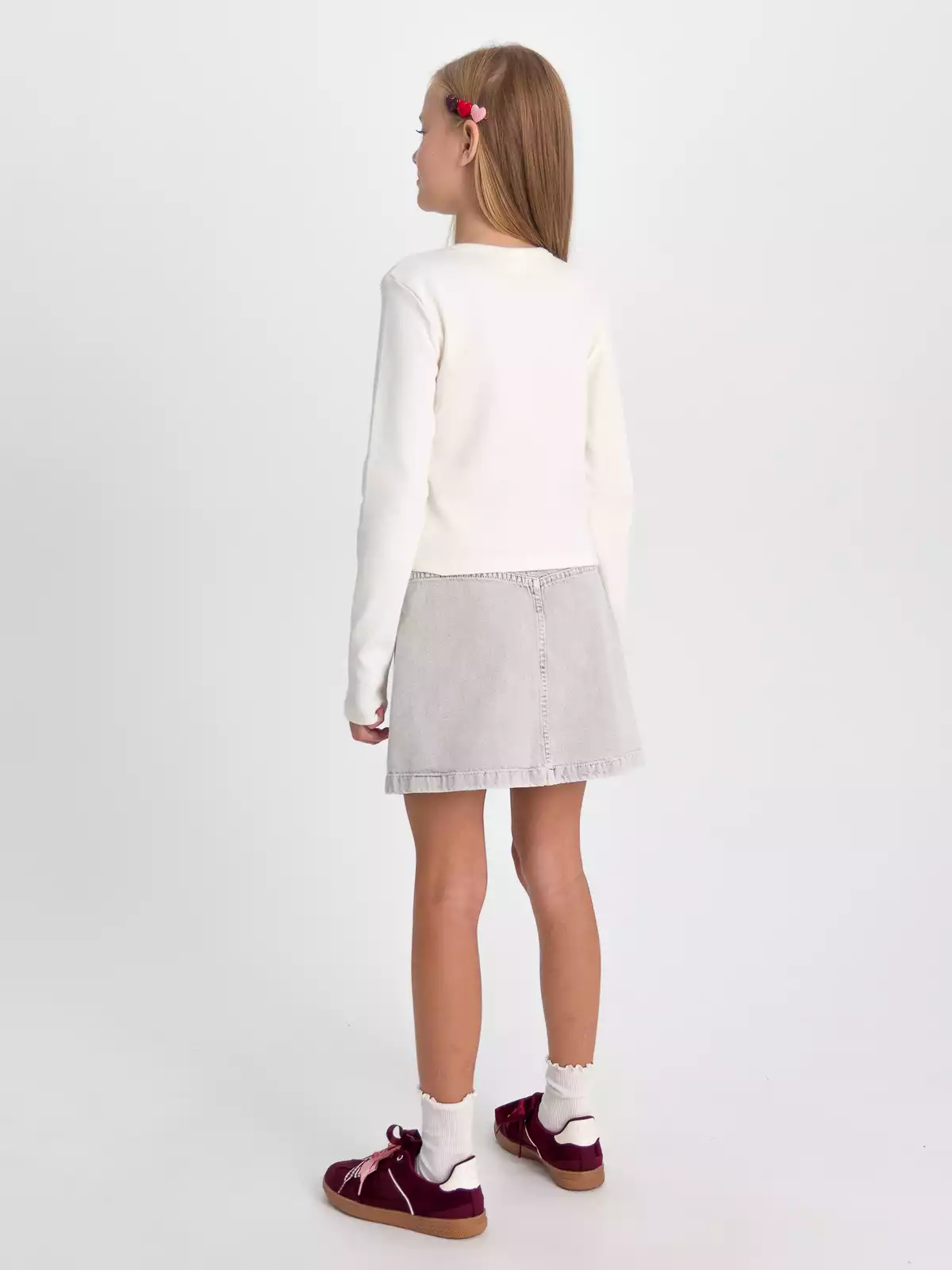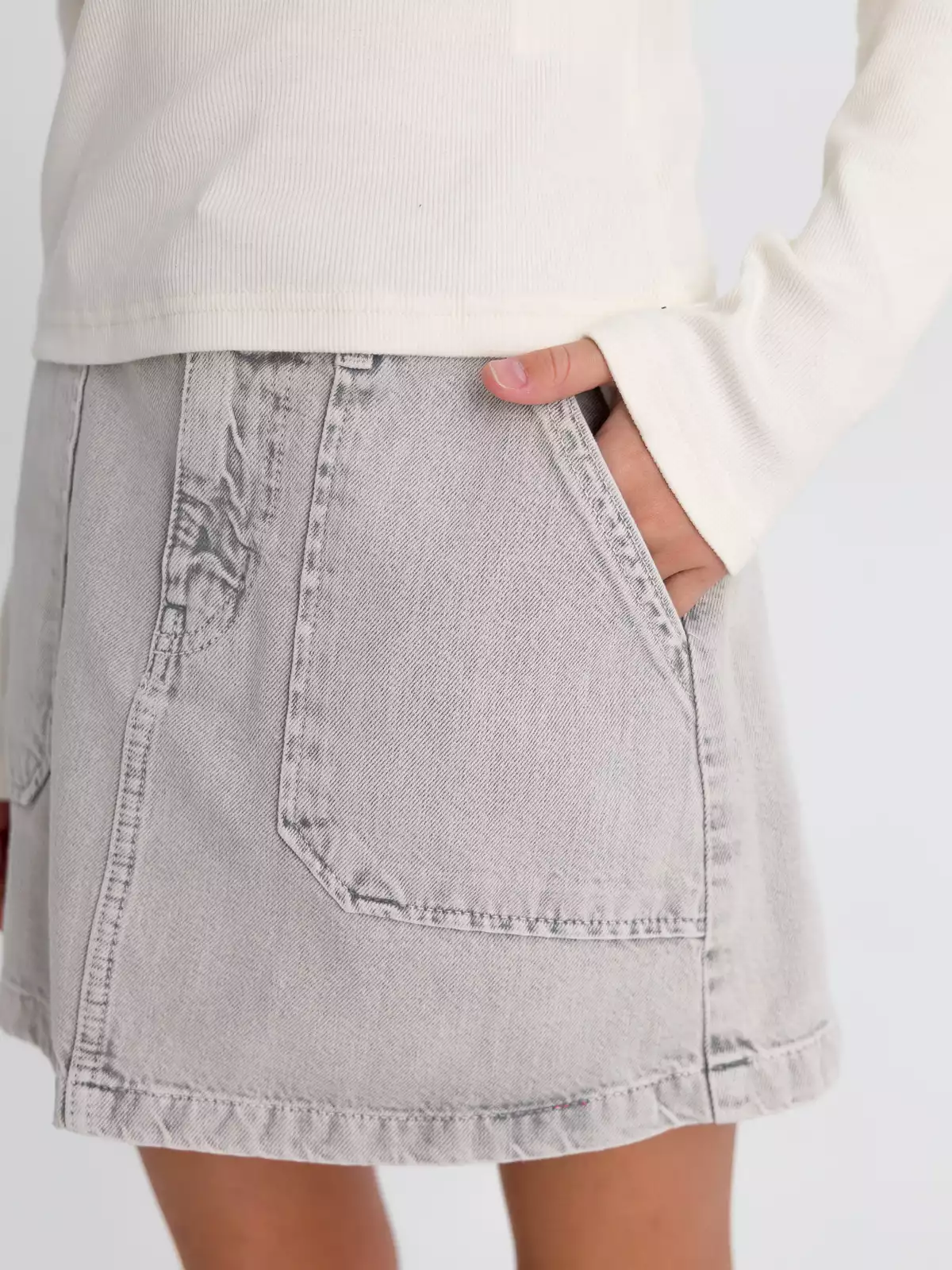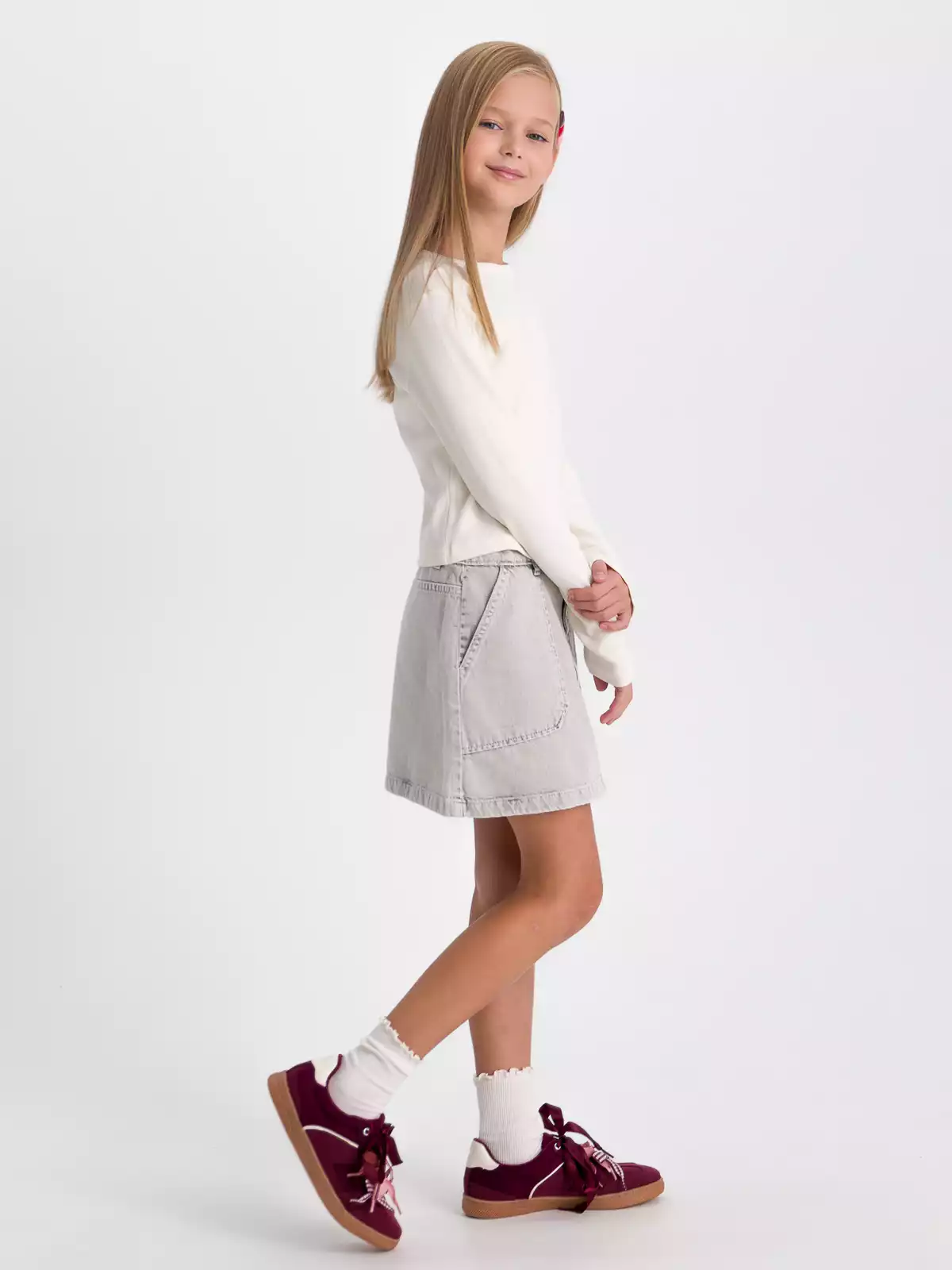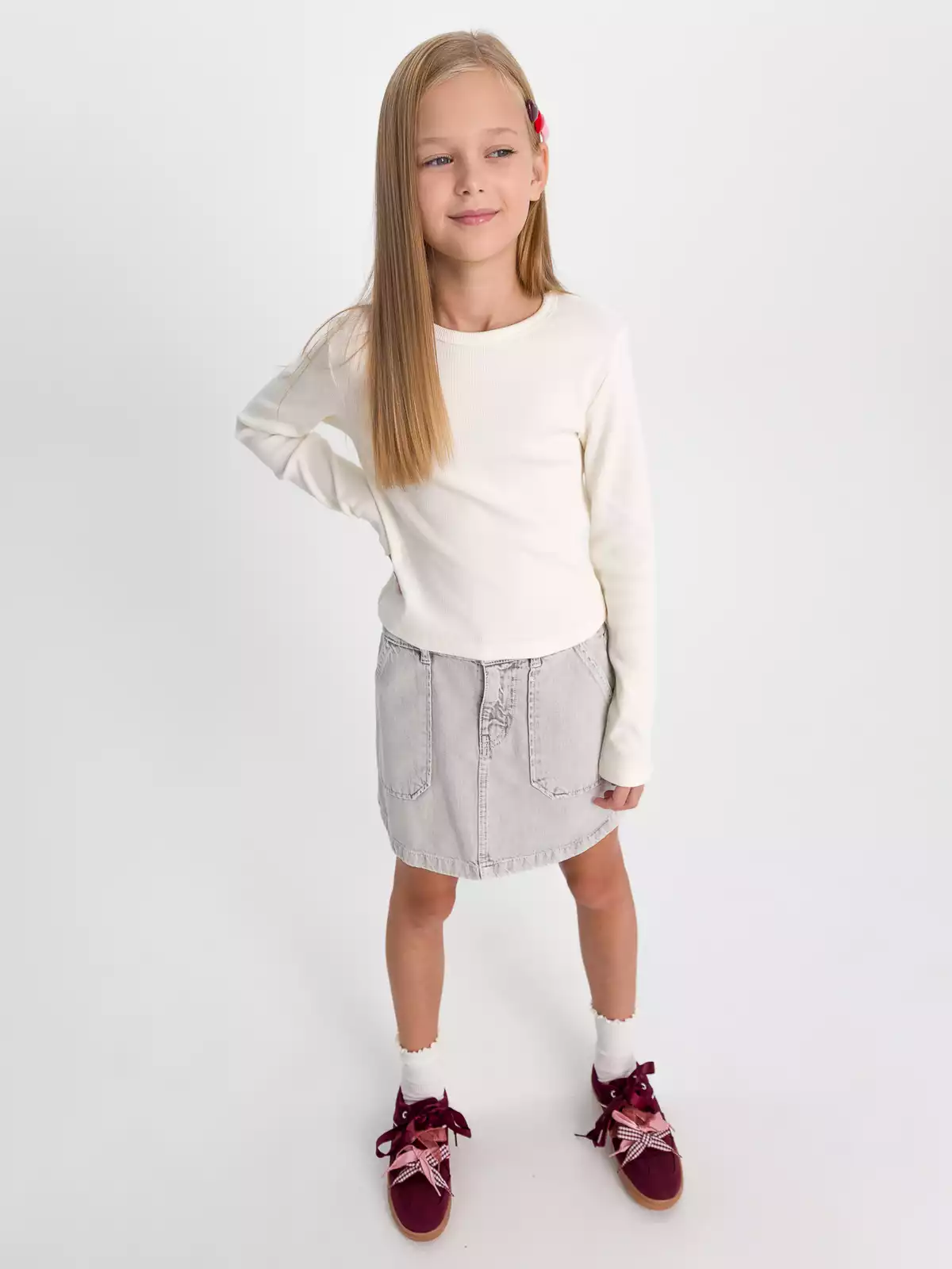 Юбка джинсовая для девочки выполнена из мягкой ткани деним, без подкладки. Модель средней посадки на застежке молния и пуговица дополнена скрытыми утяжками в поясе. Свободный крой не сковывает движения, что позволяется оставаться активным. Юбка дополнена функциональными накладными карманами. Она подходит для теплых дней, а в сочетании с колготками или леггинсами – для весны и осени. Эта стильная юбка прекрасно смотрится с кроссовками, босоножками или сапожками, создавая модные образы.
