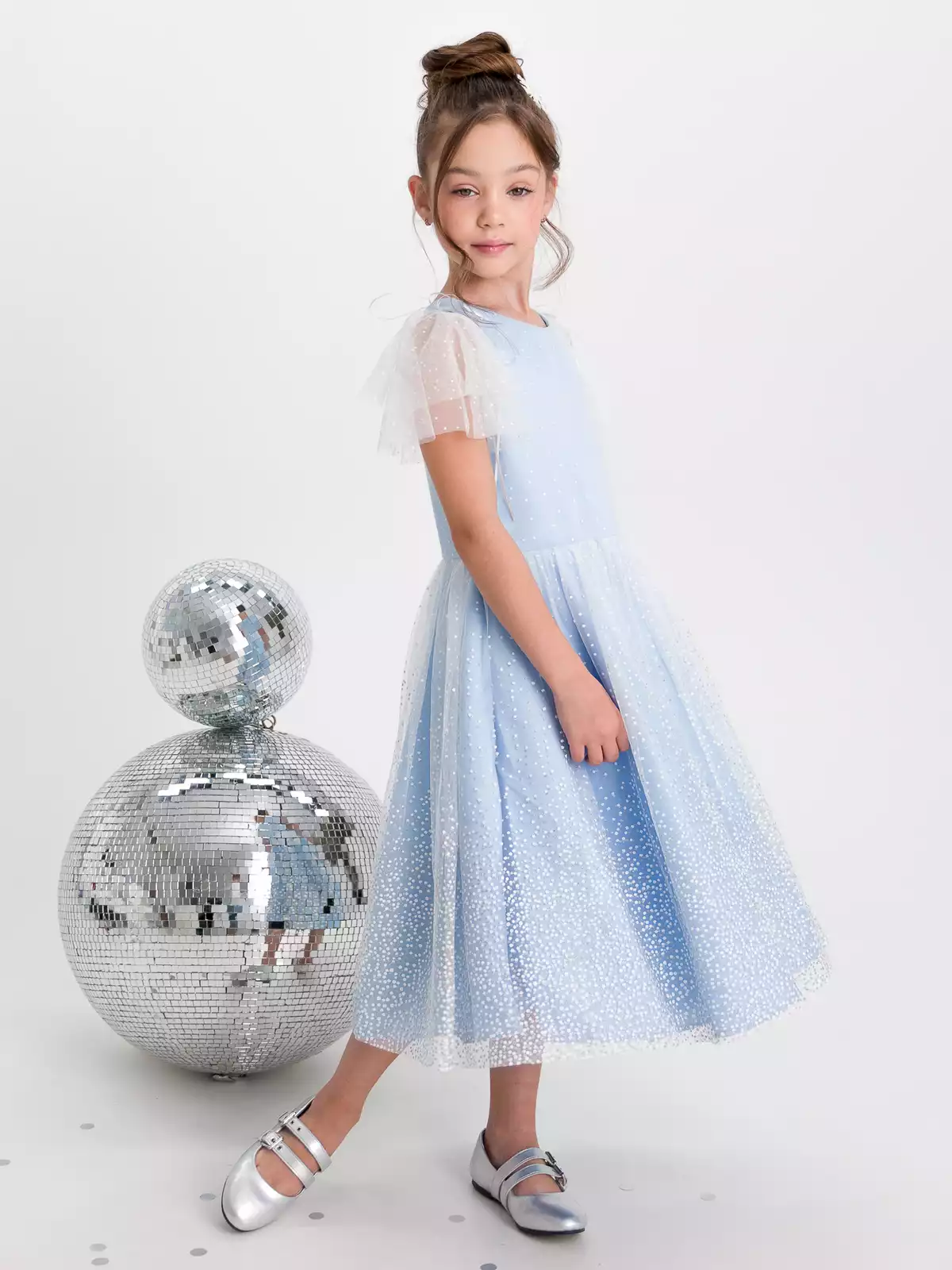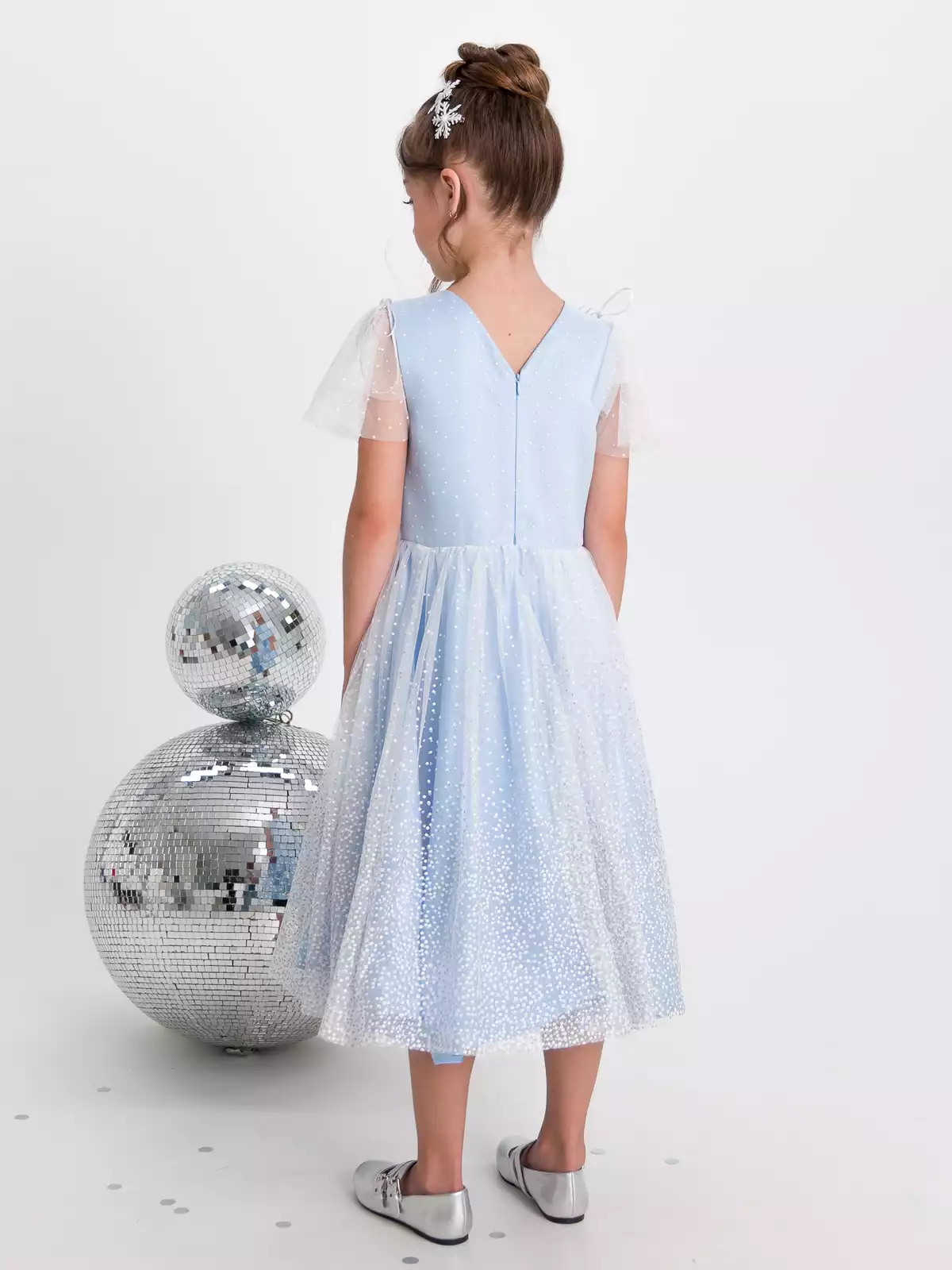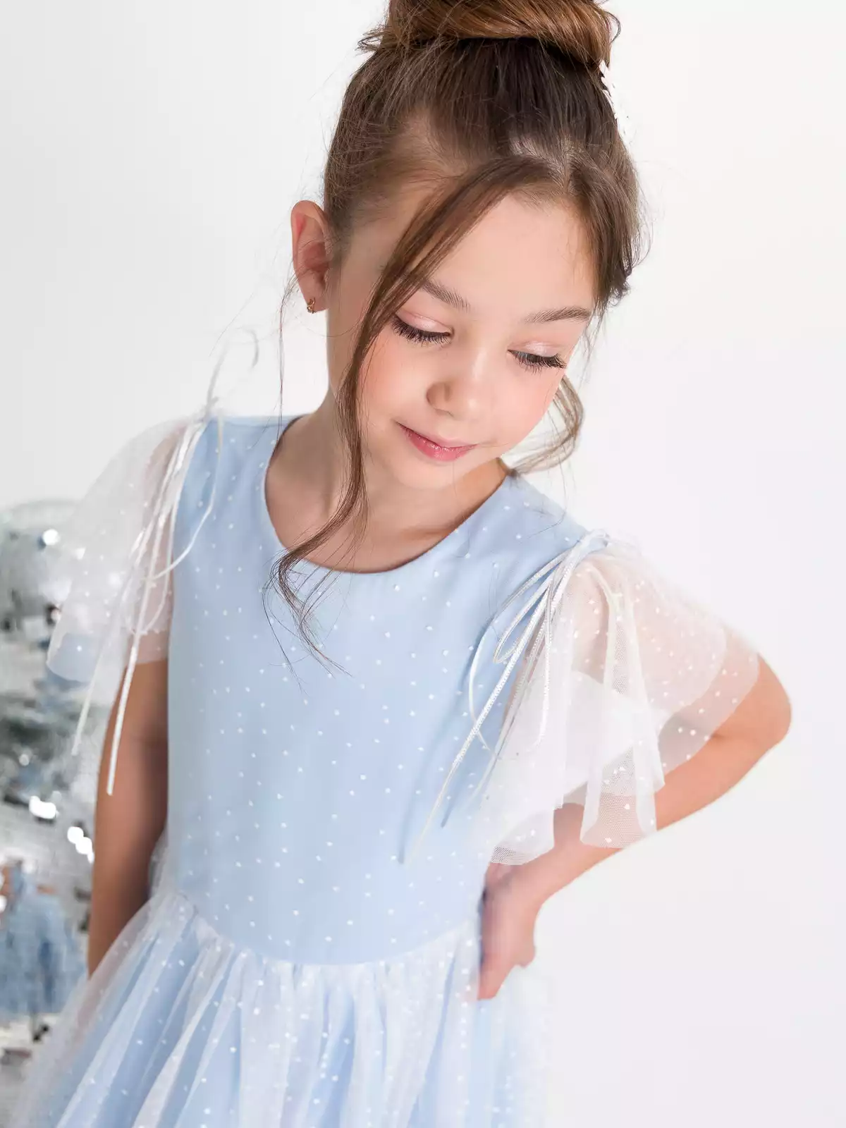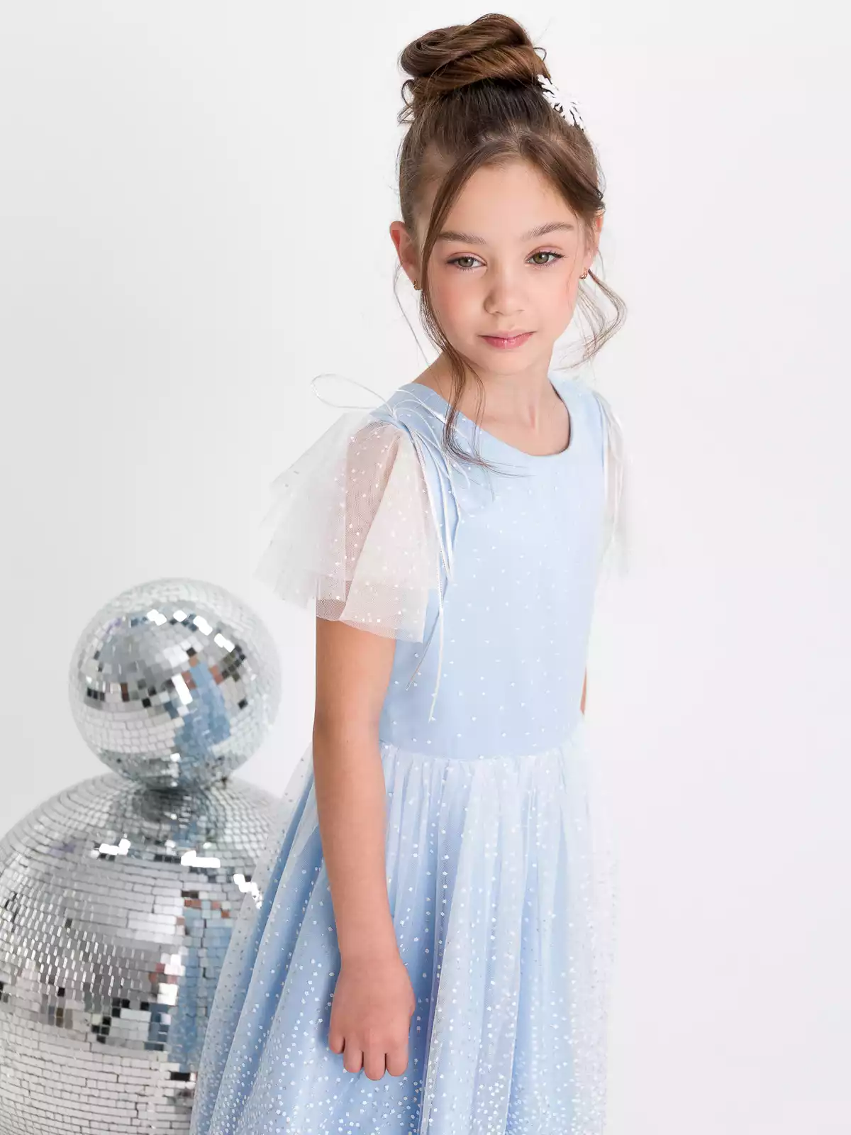 Слегка пышное и легкое платье для вашей любимой принцессы . Нарядное платье для девочки: юбка выполнена из атласной ткани, верх изделия покрывает мягкая сеточка с точечным рисунком из глиттера, модель с подкладом из 100% премиум хлопка . По спинке для удобства одевания расположена потайная молния. Легкие рукава - крылышки декорированы элегантыми бантиками, что подчеркивает индивидуальность маленькой модницы. Воздушная модель - это идеальный подарок для каждой девочки. Пышное платье отлично подойдет для фотосессии, на день рождения, выпускной, утренник или свадьбу. В таком изумительно красивом платье ваш ребенок точно будет в центре внимания.