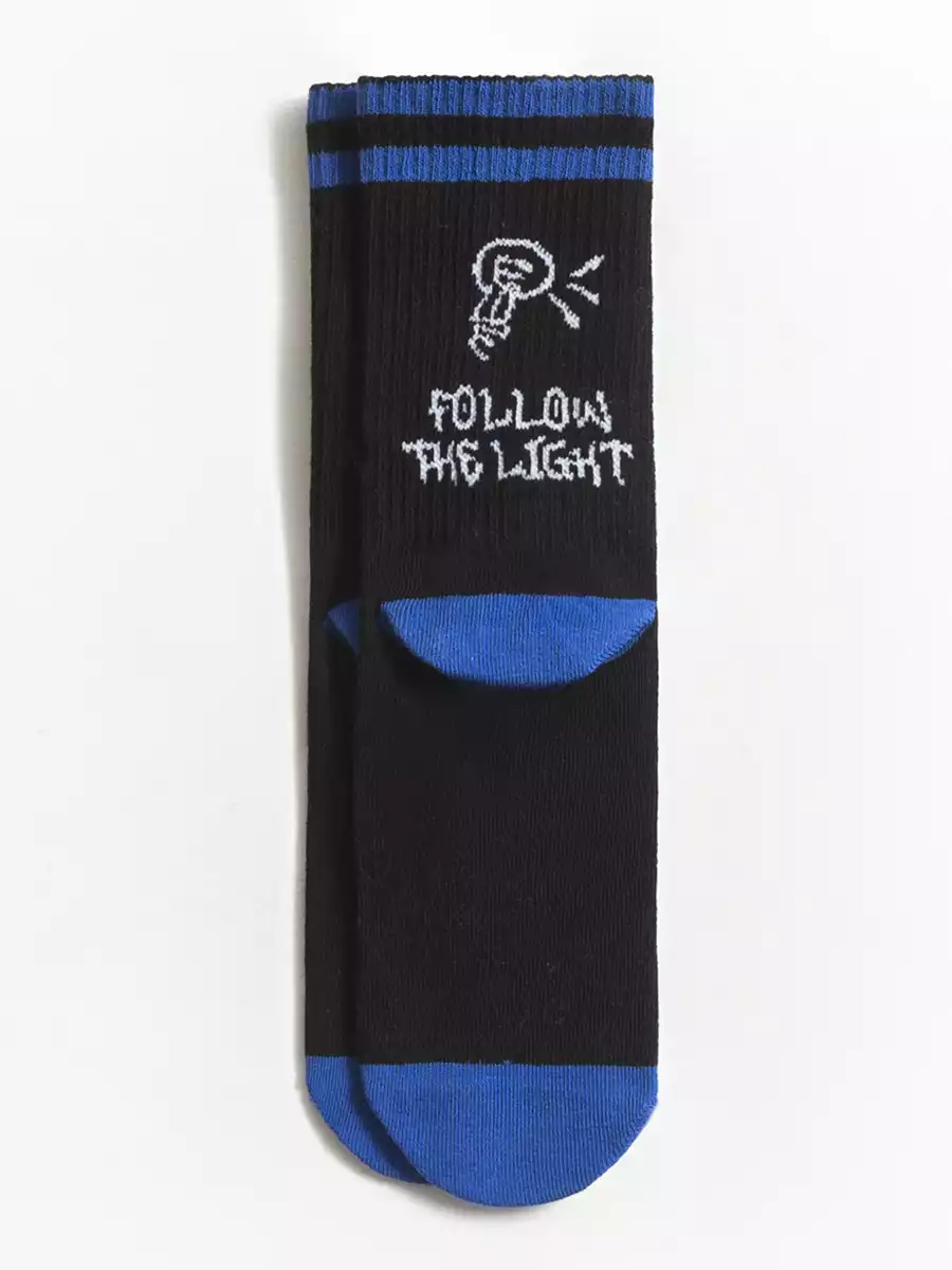 Детские носки с рисунком. Модель связана из натурального гребенного хлопка, благодаря этому обладает повышенной мягкостью, воздухопроницаемостью, защищает ножки от раздражения и дискомфорта в течение дня. Особенностью изделия является широкая спортивная резинка, которая не перетягивают и не сползает, обеспечивая поддержку при активных занятиях спортом. Носки с рисунком и надписью на паголенке «Follow the light» - это то, что оценят, как дети, так и взрослые.