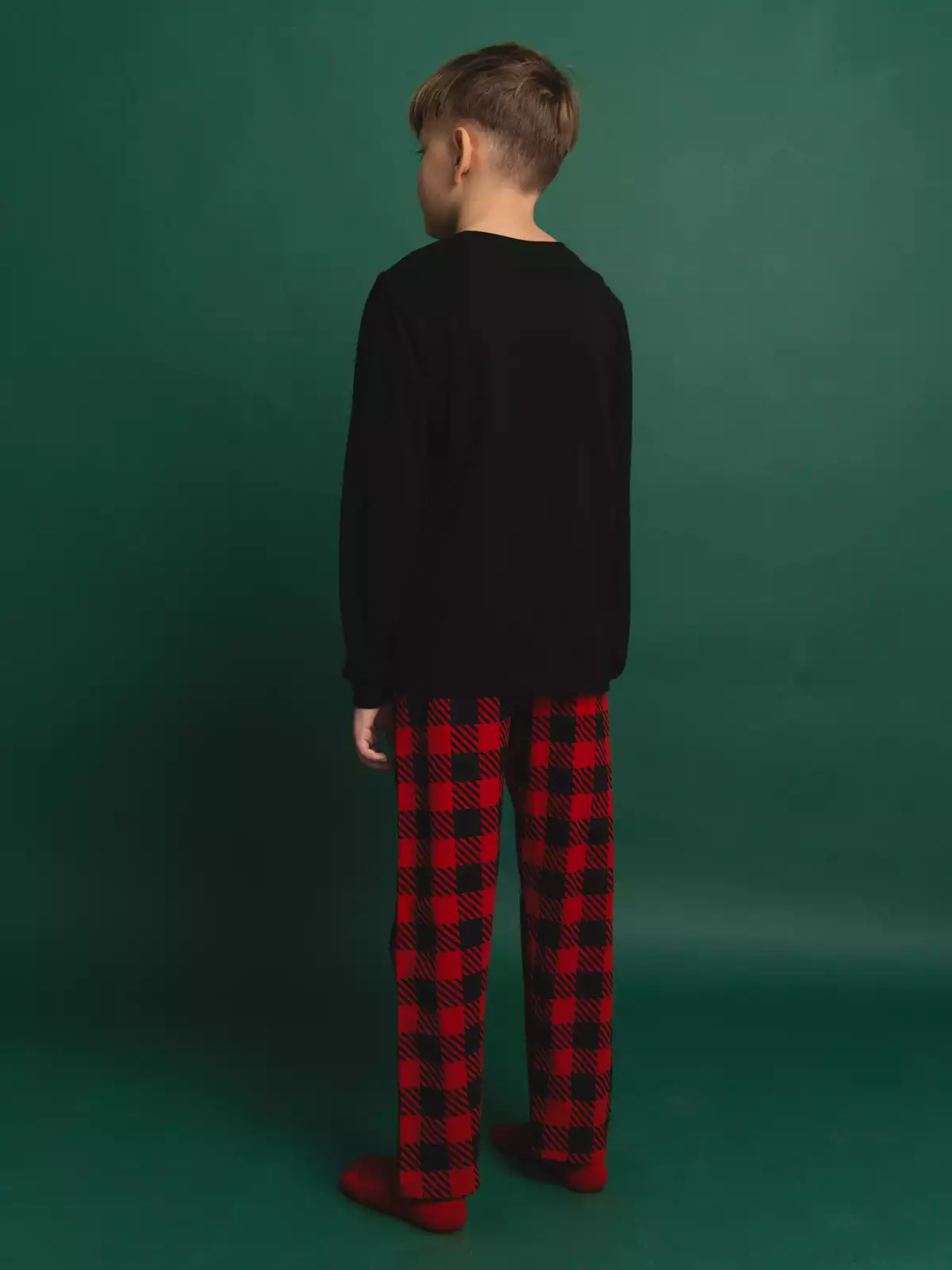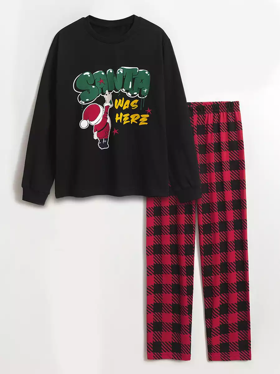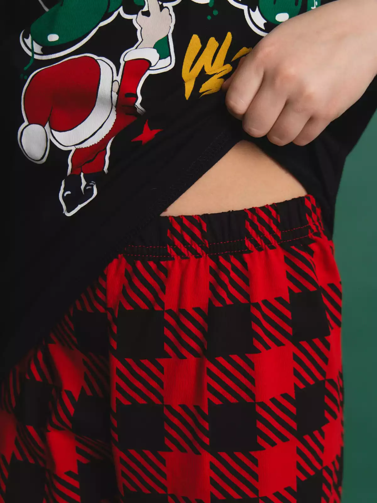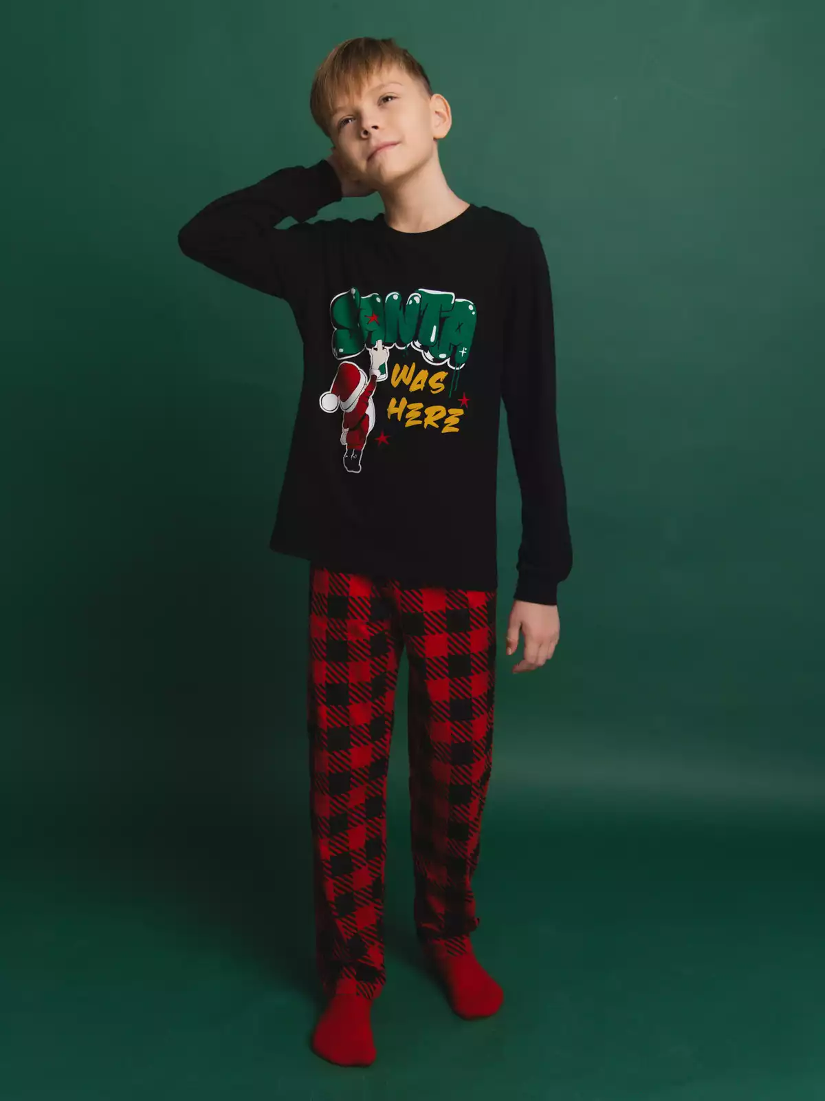 Пижама для мальчика состоит из фуфайки с длинным рукавом и штанишек. Штанишки сшиты из материала с набивным рисунком. Фуфайка из однотонного материала и спереди украшена рисунком.