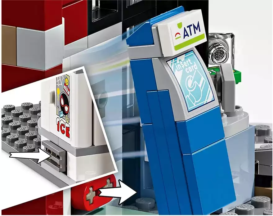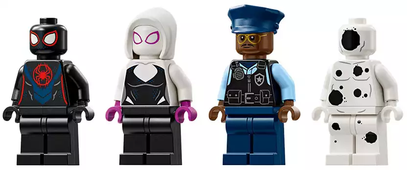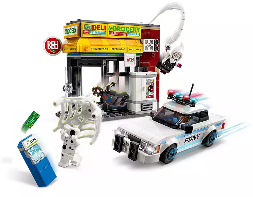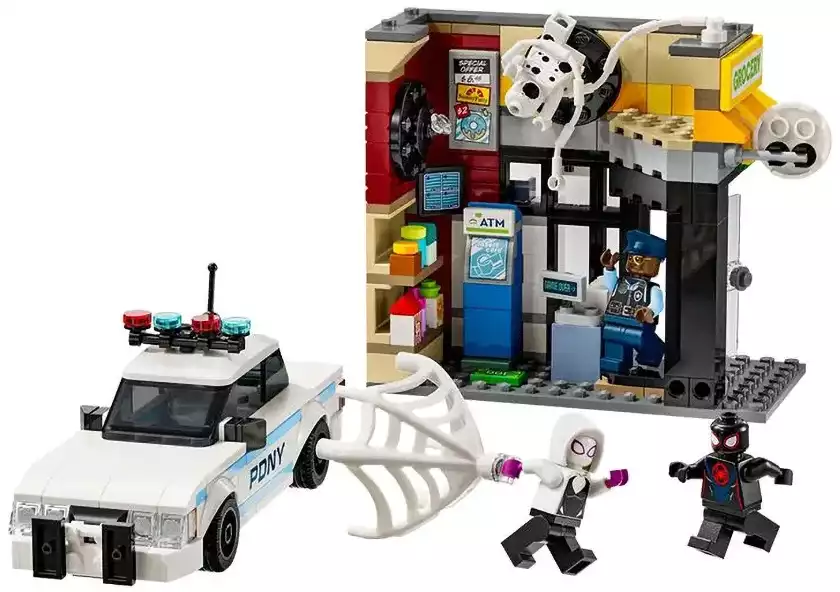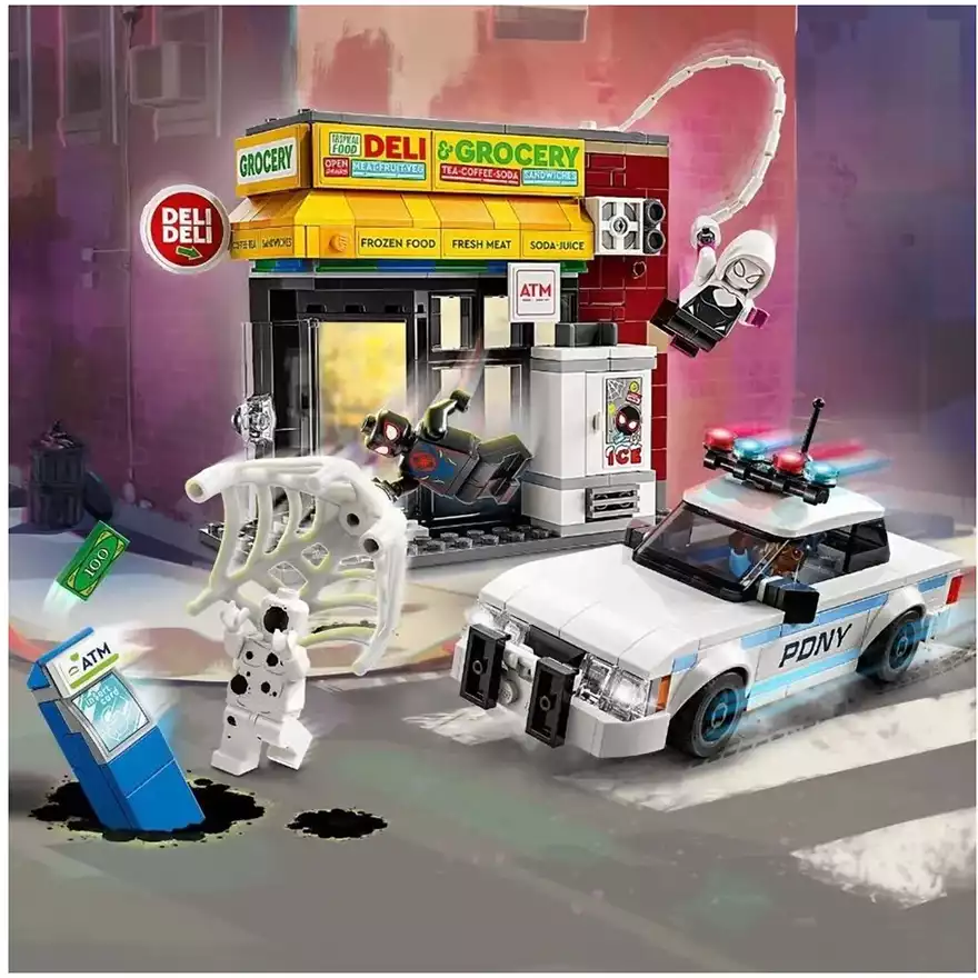 Набор включает четыре мини-фигурки: ловкий Майлз Моралес с его фирменной паутиной, хитроумный Пятно с черно-белым костюмом и уникальными порталами, бесстрашная Гвен Стейси и отважный офицер Джефферсон. С таким составом команда готова дать отпор любому злодею! В центре событий — магазинчик, где Пятно устраивает настоящий хаос. Стена здания взрывается, открывая доступ к банкомату — злодей пытается его украсть! Но Майлз и его друзья не позволят преступнику уйти безнаказанным. Полицейская машина для погони тоже входит в комплект! Чтобы поймать Пятна, офицер Джефферсон садится за руль полицейского автомобиля. Машина открывается, и в неё можно посадить сразу две минифигурки!
