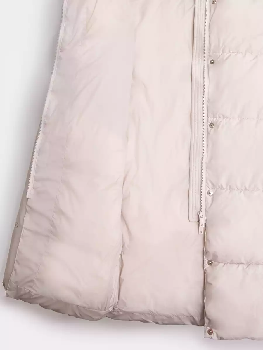 - Модель свободная, прямого кроя, удлиненная; стегана трендовой широкой стежкой;